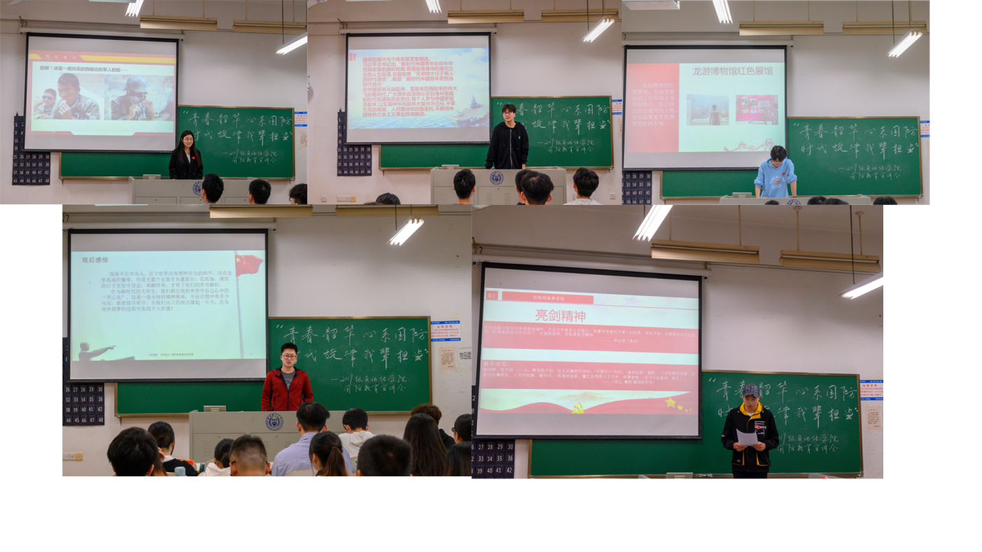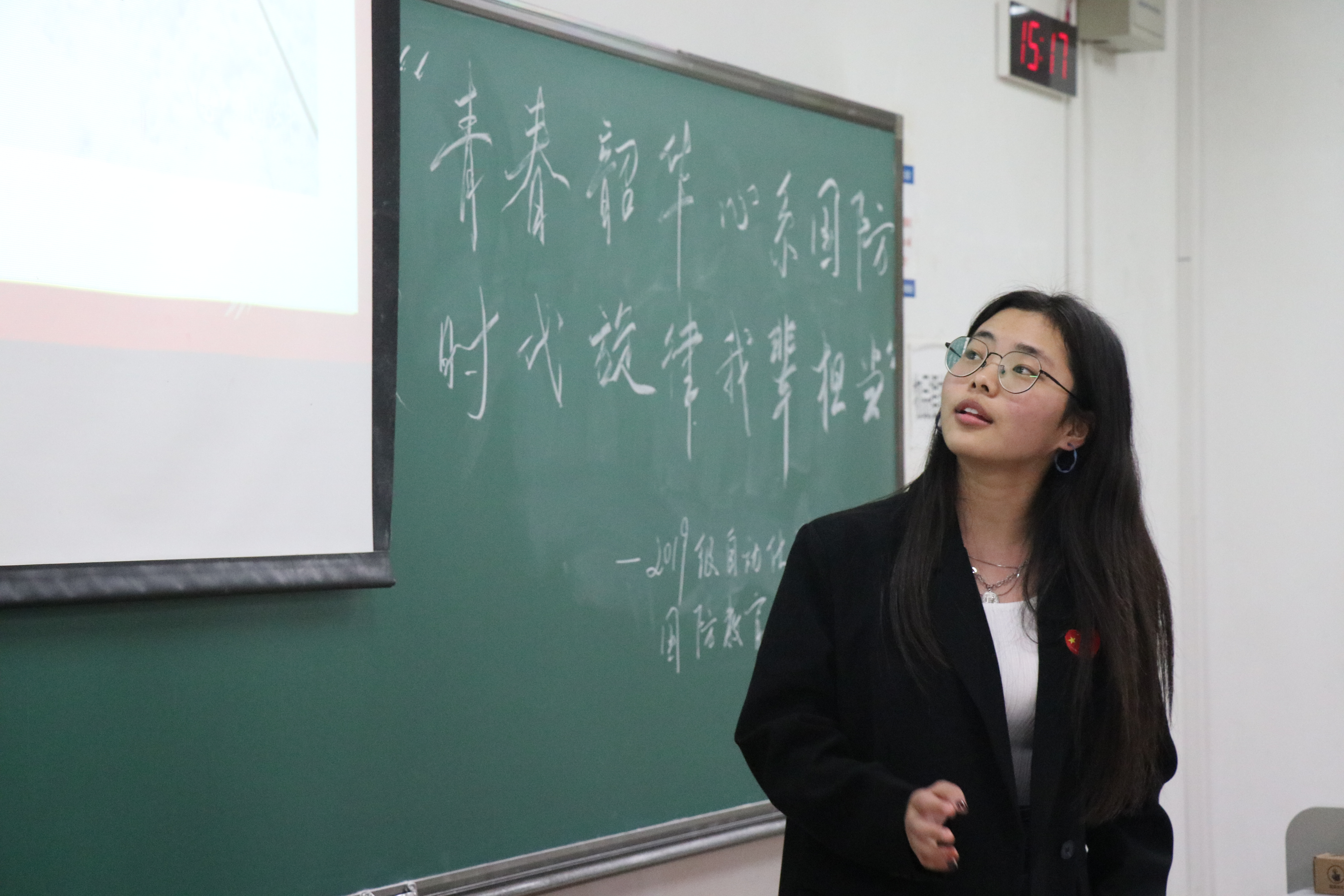 邱一程同学从国防的含义进行作为切入,深刻阐述了什么是国防,回顾了我国国防发展历程,并立足当下对新一代的年轻人在国防失业中应该做些什么进行了讨论。   肖思雨同学从国防简介、国防建设及自身参观江苏国家安全教育馆的经历三个方面为大家进行宣讲,其中在参观经历这部分为我们分享了她的所见所闻,令大家纷纷动容。   胡陈彦同学以自身参观侵华日军细菌战衢州展览馆和龙游博物馆红色展馆的经历分享了他对于国防的理解,也让大家了解到了“731”部队对于衢州人民的摧残以及中国人民奋起反抗的不屈精神。   孙光绪同学以亮剑精神导入,讲述了刘邓大军跃进大别山、雷岗战役的故事,并对孟晚舟事件发表了自己的见解,最后回扣主题说明了中国的亮剑精神带给年轻一代人的启示。   李啸澜同学进行了江苏省连云港市灌云县开山岛国防教育基地观后感的分享,为我们介绍了开山岛的概况以及他作为当代大学生的观岛感悟。