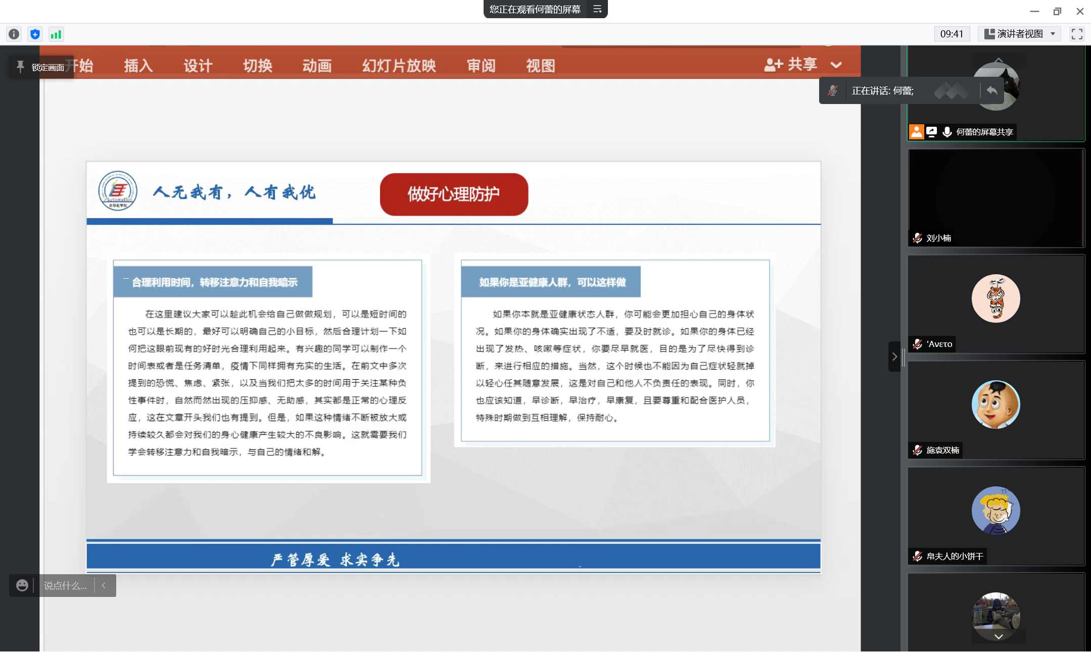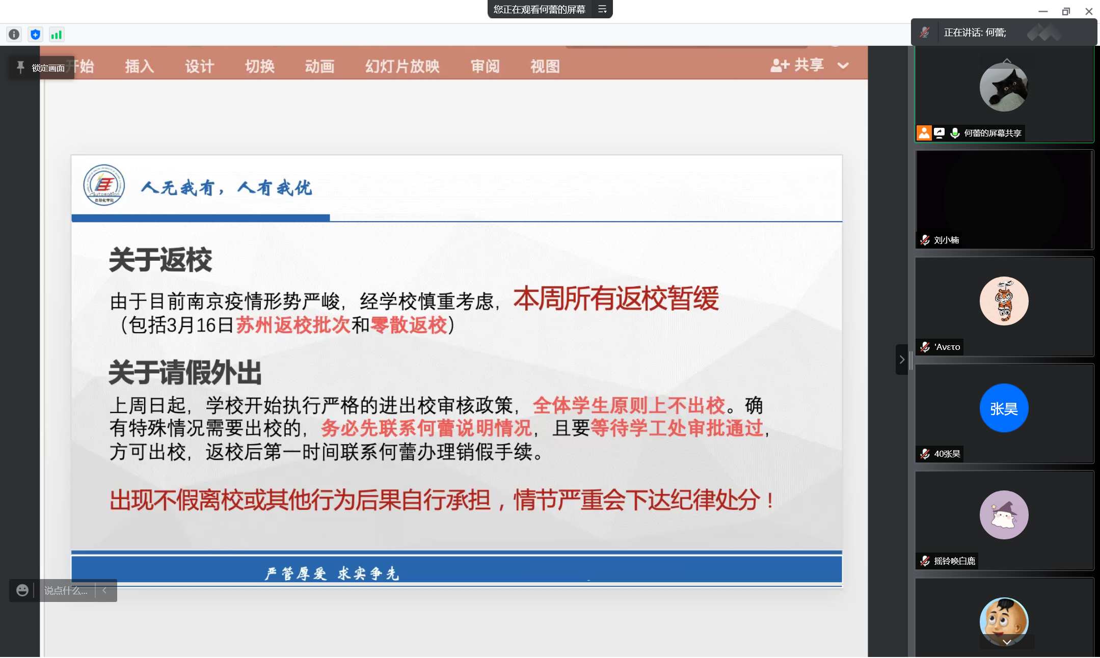 自动化学院 2019 级召开春季学期年级大会 年级新闻2022-03-152022 年 6 月 13 日 Contributor 1 comment 3月14日晚,自动化学院2019级召开春季学期线上年级大会。辅导员何蕾主持会议。 会上,何蕾首先介绍了当前国内疫情形势和学校防疫政策,提醒同学们对自己、对集体的安全负责,遵守防疫政策,早日结束疫情。 之后,何蕾对同学们做了心理疏导,介绍了校内心理咨询以供有需要的同学使用。最后,何蕾指示各班应该做好对未返校同学的线上课程安排工作。年级大会顺利结束。 文/王煜程 图/王煜程 许怡岚