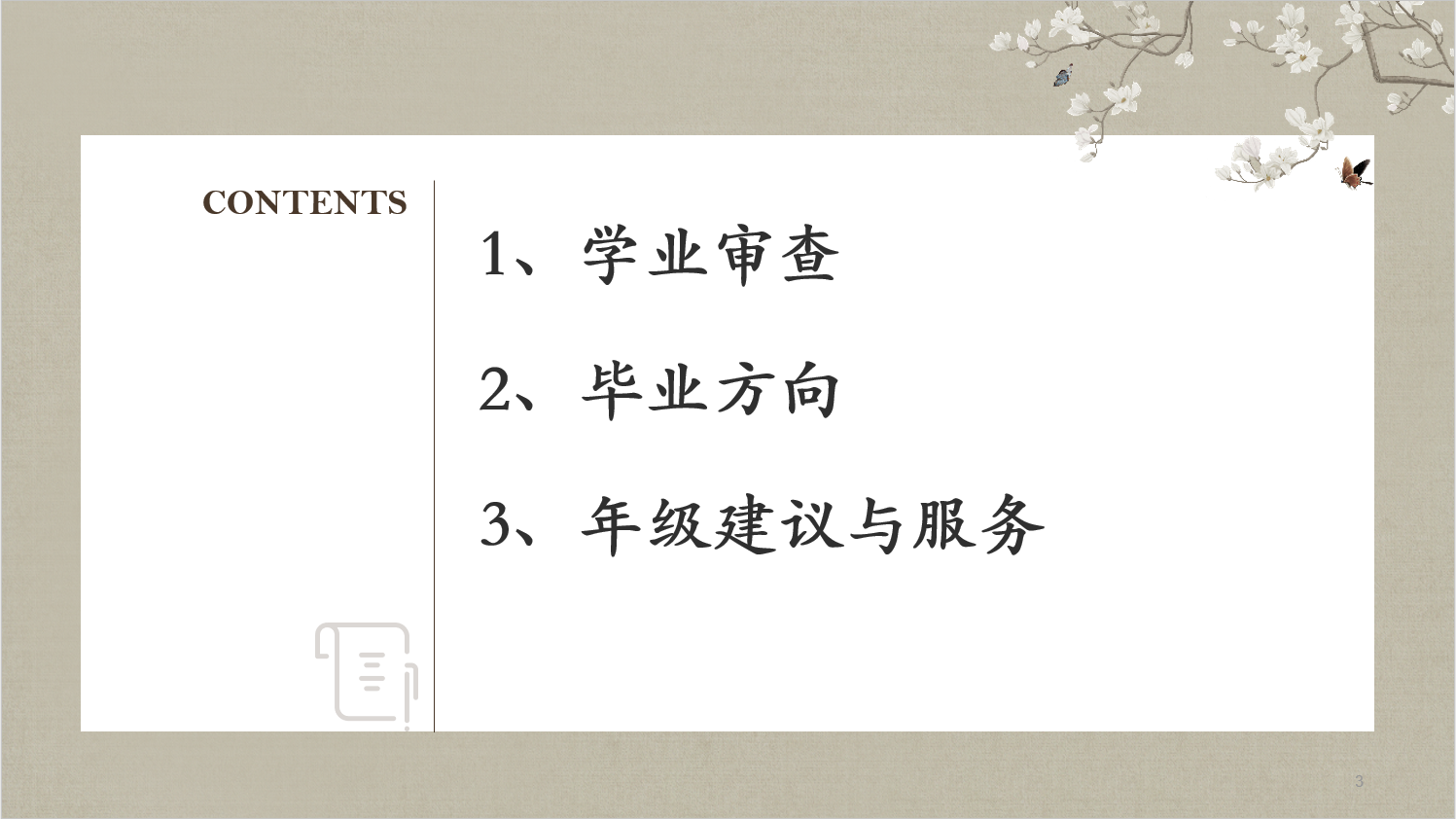 何蕾在会上向家长介绍了学业审查、毕业方向、年级建议与服务三个方面内容。