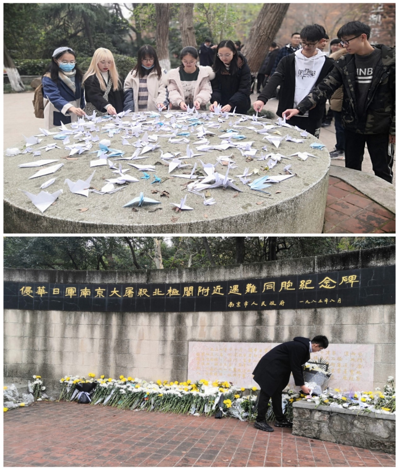 在北极阁丛葬地,同学们神情肃穆,追思历史,缅怀革命先烈。由班长王梦轩同学为遇难同胞献花,同学们自发的准备了千纸鹤,放于丛葬地纪念碑前,表达对遇难者的同情及美好祝愿。